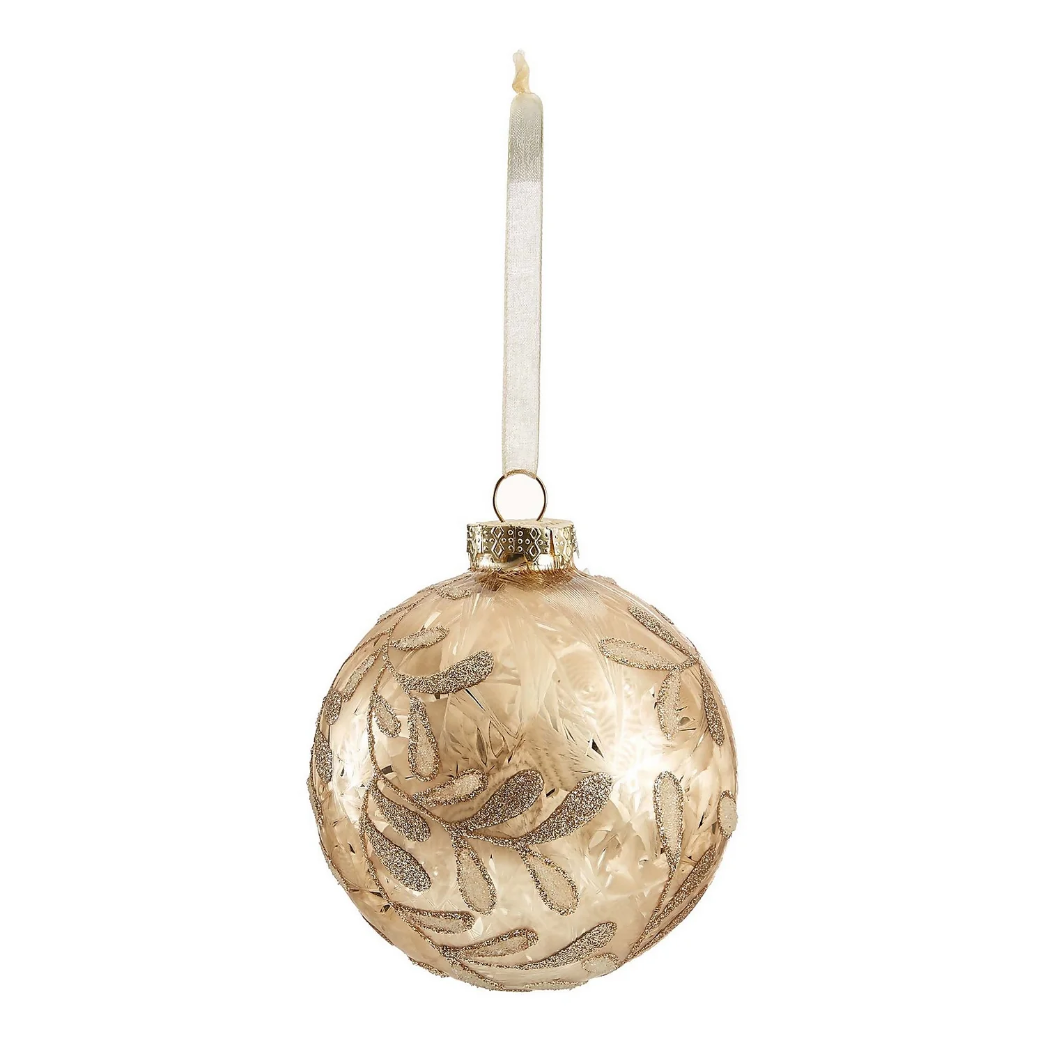 Add elegance to your Christmas décor with this gorgeous gold bauble. Beautifully hand-painted, this intricate glass bauble features a glitter leaf design that wows. It would look wonderful nestled amongst your Christmas tree branches.